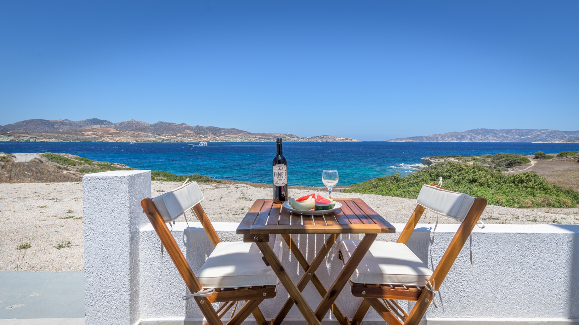 Our Deluxe Studio is an excellent option, ideal for a couple. There are two deluxe studios, both located on the ground floor, at the front side of the building, with their own beautiful veranda with a beautiful, direct sea view.