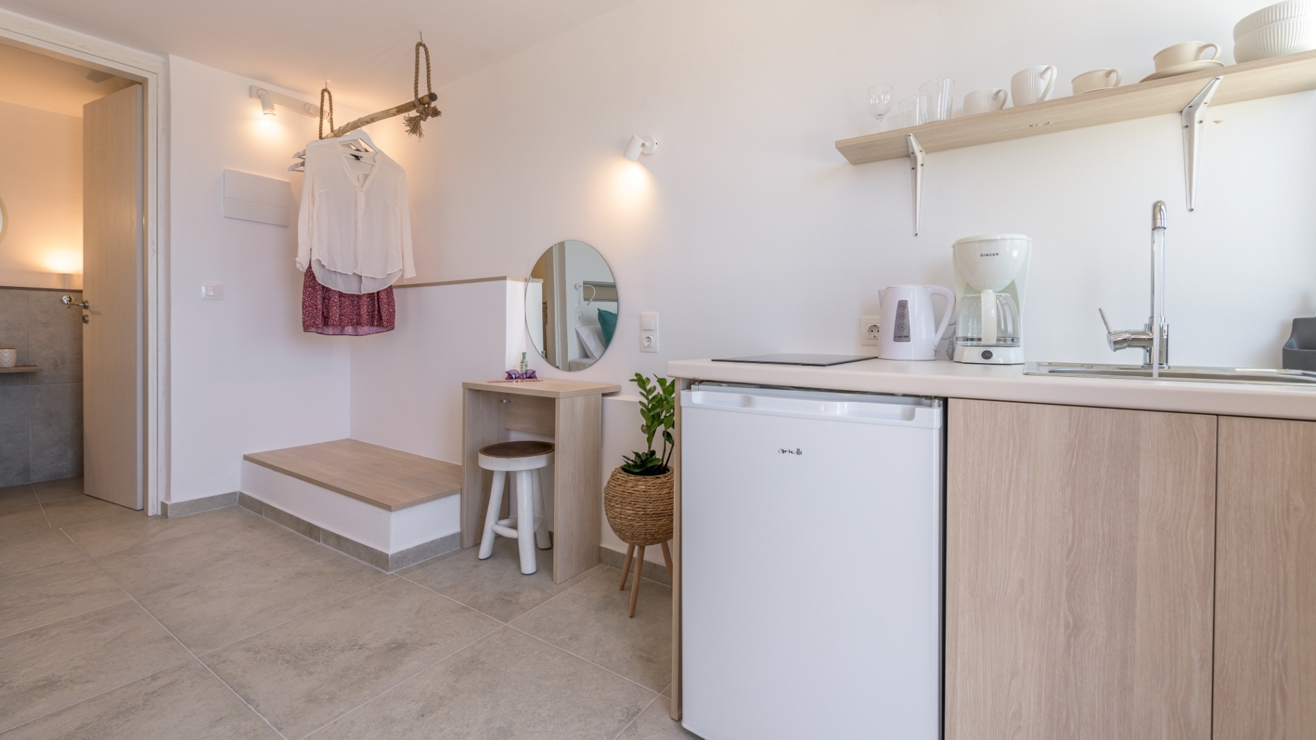 The deluxe studio features a double bed, a kitchenette and sitting arrangements in the same comfortable space, and a bathroom with a shower. It is more than spacious for 2 guests and you can make the most of the beautiful veranda.